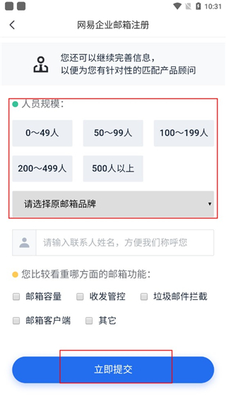 5、然后选择人员的规模以及原邮箱的品牌等,即可进行注册了哦。