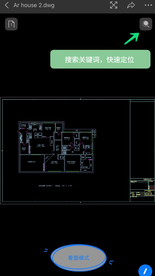 3、打开DWG图纸默认进入快速看图模式,可进行平移缩放和测量工作,不会因为误操作而修改图纸数据。还可以通过搜索文本对象,查找并定位文本所在的位置。