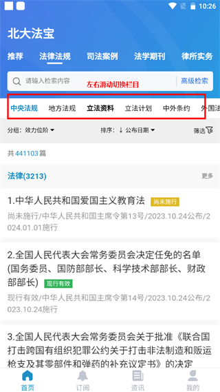您可以左右滑动选择不同的栏目,点击检索输入框输入关键字进行检索