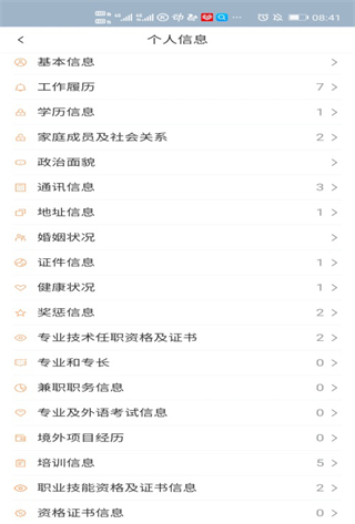 1、员工点击“个人信息”后,能够查看所在单位开放显示/修改的信息项。