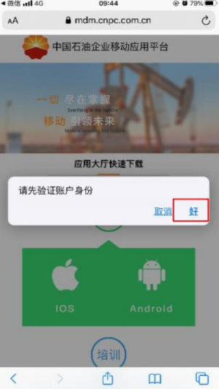 步骤1:苹果手机需要先通过网址https://emp.cnpc.com.cn下载或扫描二维码安装“中国石油企业移动应用平台”。进入安装界面,在弹出的界面上点击安装描述证书。
