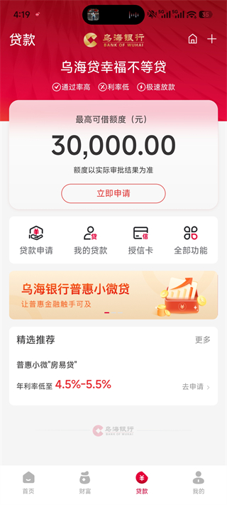 乌海银行手机银行聚合了整存整取、通知存款、稳健理财等多元化财富管理产品,帮助用户实现资产保值与增值。同时,还提供小微贷等融资服务,支持线上贷款申请与授信卡管理,满足个人与企业多样化的资金需求。