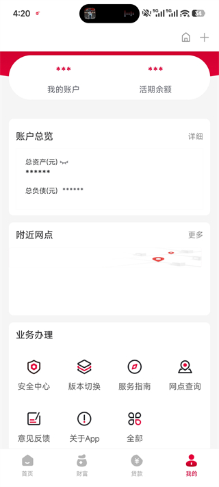 展示账户总览、附近网点,提供安全中心、业务办理等个性化服务及功能管理。