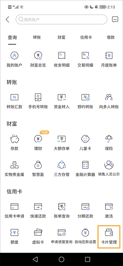2、然后在信用卡这栏中点击“卡片管理”。