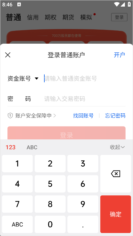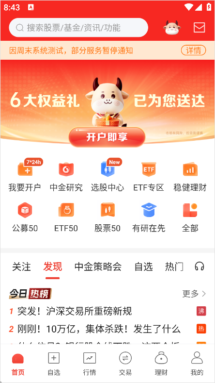 1、用户首次使用中金财富无需立刻开户,也可以体验行情、资讯和操作界面。