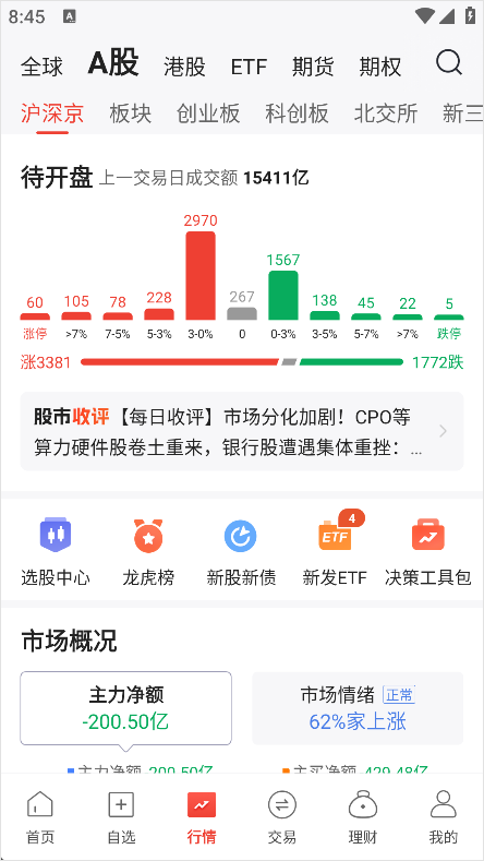 4、行情页面提供包括A股、港股、自选股盘面查看、涨跌幅等行情板块,支持实时刷新。
