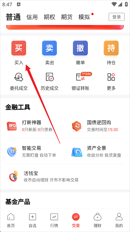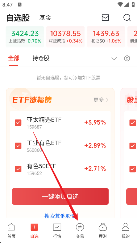 点击“交易”页面,选择A股或港股(若已开通港股权限)。