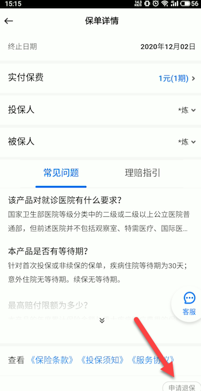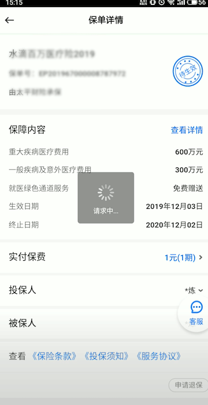 3、在保单详情页点击右下角的申请退保即可。
