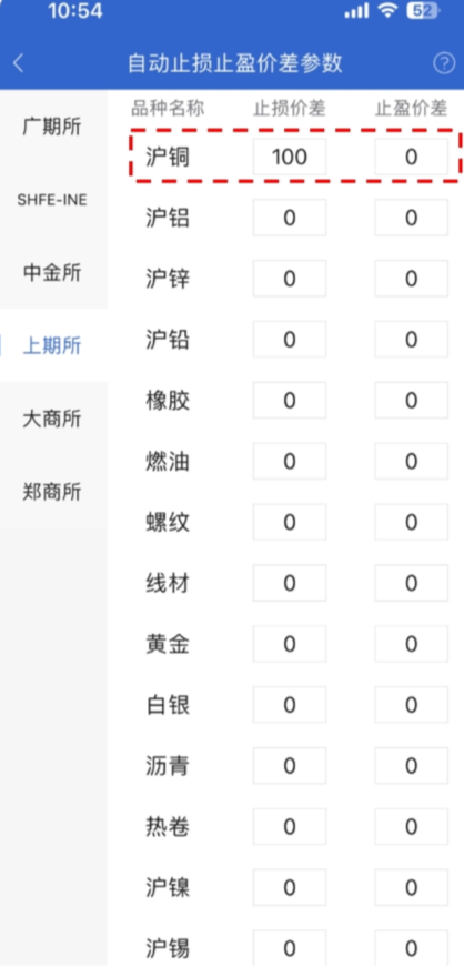 D、自动止损止盈参数:设置自动止损止盈价差参数需先打开【开仓自动止损止盈】右侧的开关,打开后点击【自动止损止盈价差参数】,即可设置自动止损止盈价差参数。