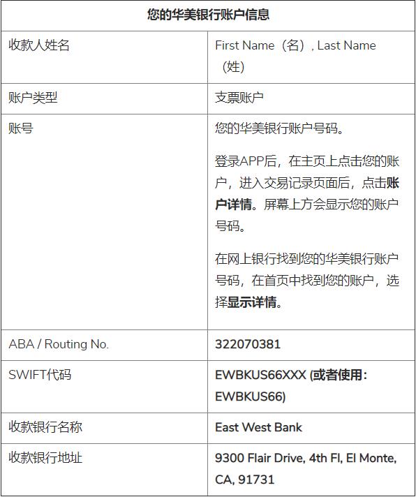 1、联系您要发起转账的美国本土银行、托管账户或金融机构,并要求通过电汇方式转至您的华美银行账户。