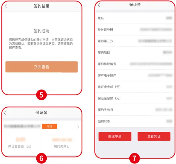 5、点击“确定”提交,提交成功后显示“签约成功”,点击“立即查看”,选择对应的开发商,显示当前状态为“冻结”,说明验资缴存及冻结步骤完成。