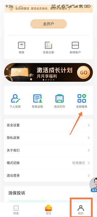 1、打开新网银行App,点击【我的-全部服务】