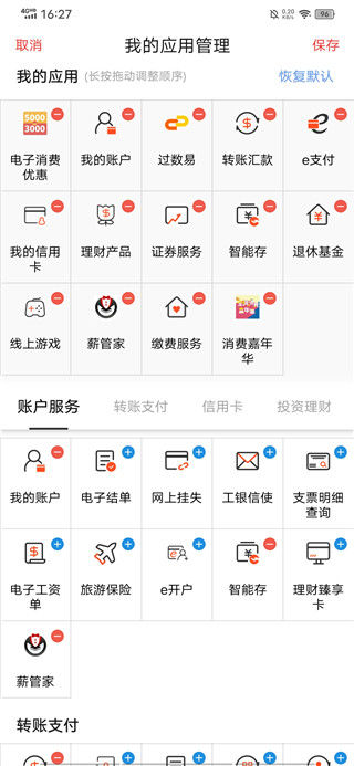 首页全面改版,头部新增我的账户、我的明细、我的外汇、我的支付四大金刚区功能。以多楼层结构展现内容,您可通过楼层内链接快速办理业务,还可以按您的日常操作习惯进行排序。