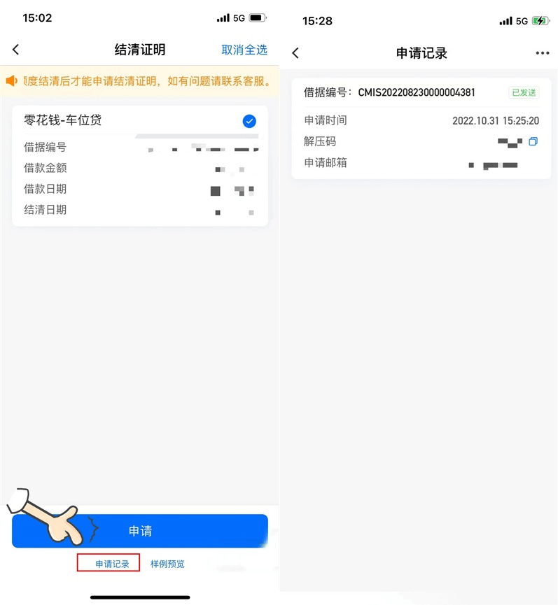 1、支持近一年内结清的贷款在线开立结清证明后导出发送至邮箱。