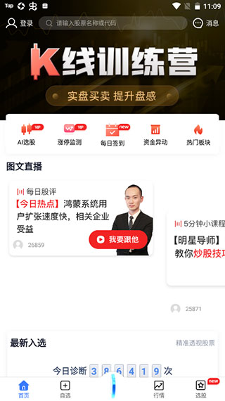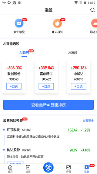 3、进入自选功能模块,根据推荐进行选择股票