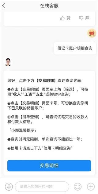 3.在郑州银行手机银行首页,点击右上角耳机图标,进入在线客服回复”交易明细“,点击即可查看。