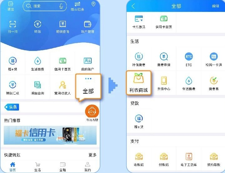 操作路径:手机银行APP首页-全部-利农商城