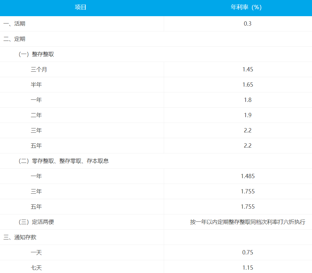 人民币个人存款挂牌利率表