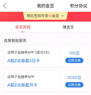 1、兑换智能服务。也就是大家熟悉的量化操盘神器——Z点操盘啦,点击“立即兑换”按钮即可兑换后使用(下同)。目前100金豆可以兑换3天使用权限,2000金豆兑换Z点操盘30天使用权限。