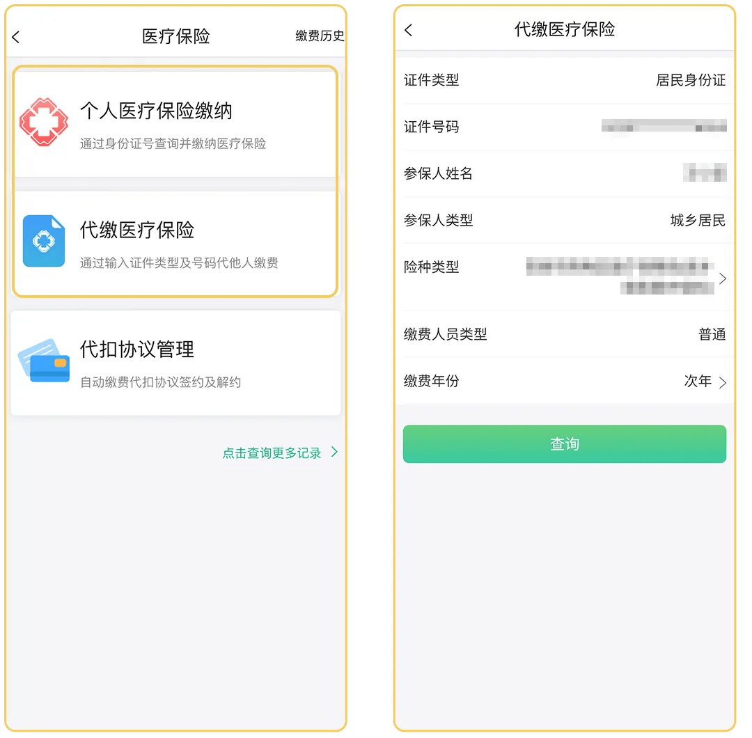 步骤二:个人缴费选择“个人医疗保险缴纳”,他人代缴选择“代缴医疗保险”,输入参保人个人相关信息后,点击“查询”核对相关信息