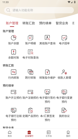 3、在企业银行界面提供了账户管理、转账汇款、预约清单等多种明细分类。