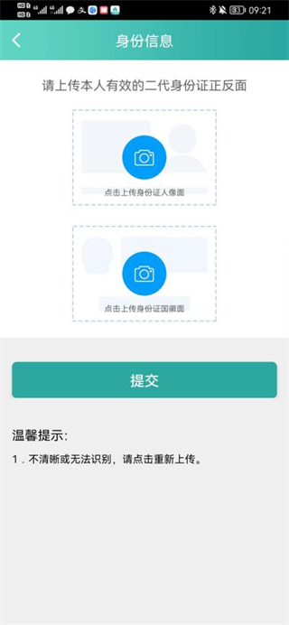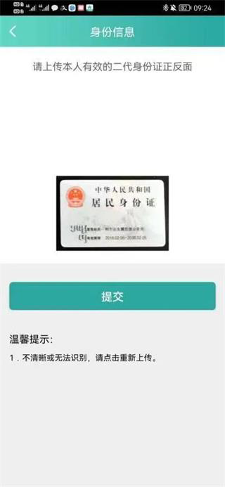4、上传身份证信息,按指示文字操作上传身份证正反面。上传完成之后点击“提交”,系统自动识别您的姓名及身份证号码,身份信息核对无误后点击“下一步”。