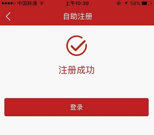 7、页面提示“注册成功”,用户即获得短信转账权限(单笔5万元、日累计5万元),点击“登录”按钮,输入用户名和密码登录手机银行开始使用吧。