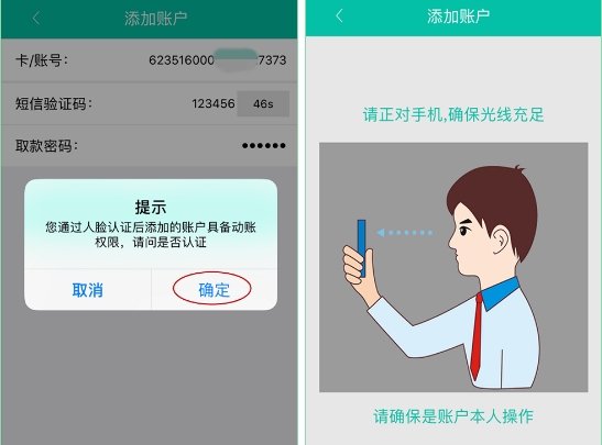 只有完成人脸识别,添加的账户才具有交易权限,否则只有查询权限,交易限额与主账户相同且共享额度点击确定进行人脸识别,根据提示完成人脸识别规定动作,提示绑定成功,账户查询界面显示新绑定账户。