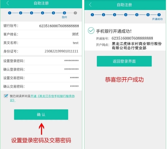 设置登录密码和交易密码阅读并同意《黑龙江农信手机银行服务协议》,确认签约,提示开通成功