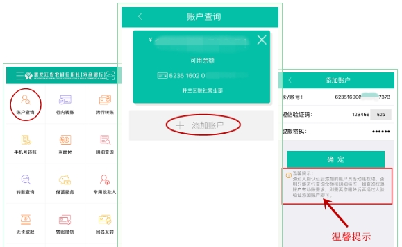 进到账户查询界面,点击添加账户输入要绑定的账号、获取短信验证码并填入、输入取款密码,点击确定弹出提示框