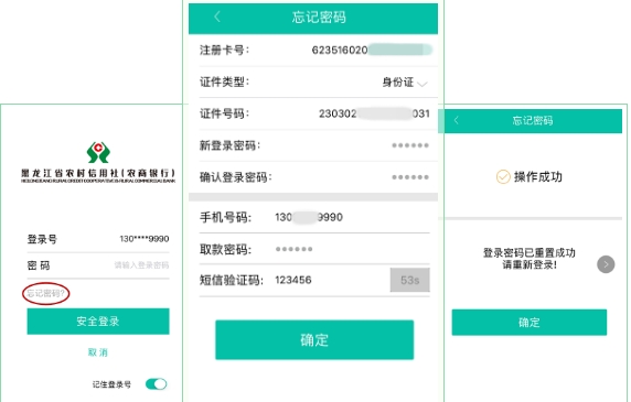 首先将手机银行更新至最新版本进入手机银行登录界面 点击忘记密码,输入账号、身份证号、设置新密码(6-18位字母和数字的组合)、预留手机号,校验取款密码,获取短信验证码并输入,验证通过,重置密码成功。返回登录页面重新登录即可
