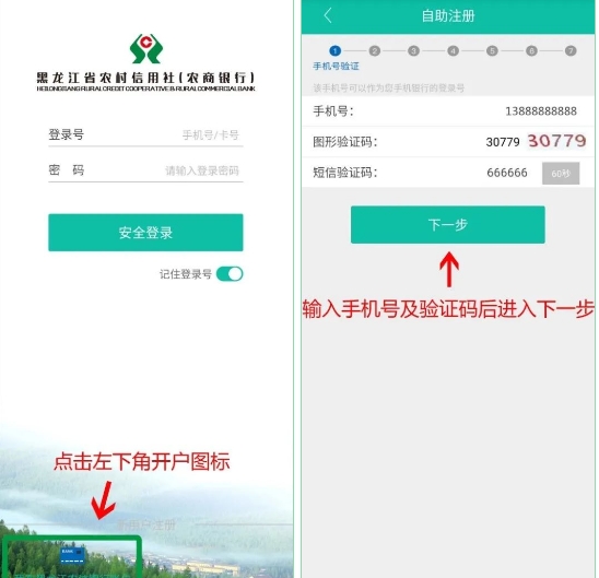 打开“黑龙江农信”手机银行APP点击左下角开户图标输入手机号码、图形验证码和短信验证码