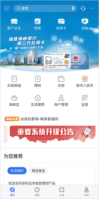 1、进入海峡银行App后,用户可以在首页中进行账户总览、转账等操作。