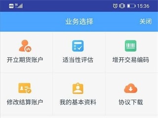 支持在线开户,适当性评估(含激活),增开交易编码,修改银行账户,修改基本资料业务。点击首页“在线开户”,进入业务选择页面。