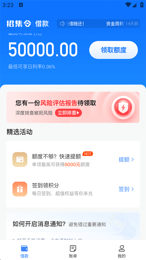 1、借款:下载登录即可领取5w元额度,还可以提额度,更多活动豪礼等你上线领取;