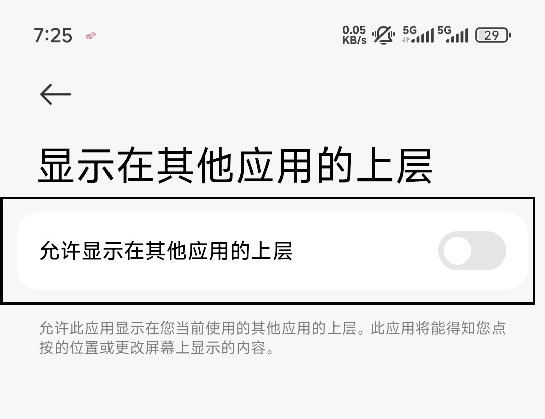2、点击开启权限允许显示在其他应用的上层;