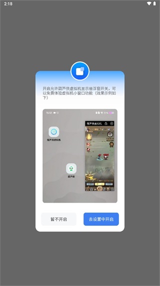 1、首次进入葫芦侠虚拟机App需要在设置中开启悬浮窗权限;
