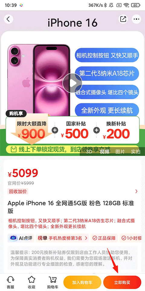1、打开九机网APP,选择需要分期购买的手机,点击【立即购买】;