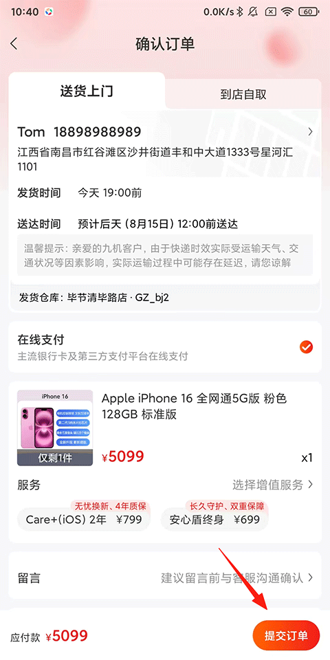 2、填写相关信息,如收货地址、手机号等,确认无误后点击【提交订单】;