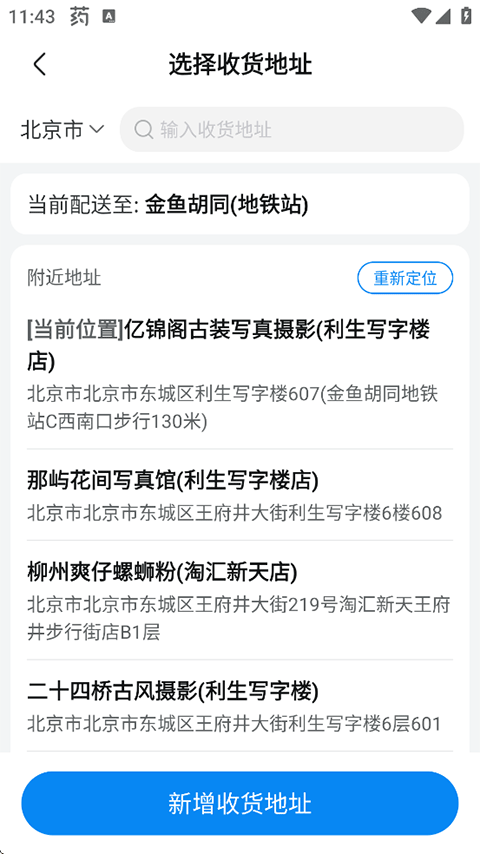 2、搜索定位到您当前所在的位置以确认配送地址,或是新增一个收货地址;