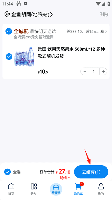 6、点击“购物车”确认购买商品,再点击“去结算”;