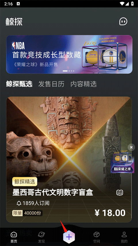 1、首先进入鲸探数字藏品App,点击下方加号;