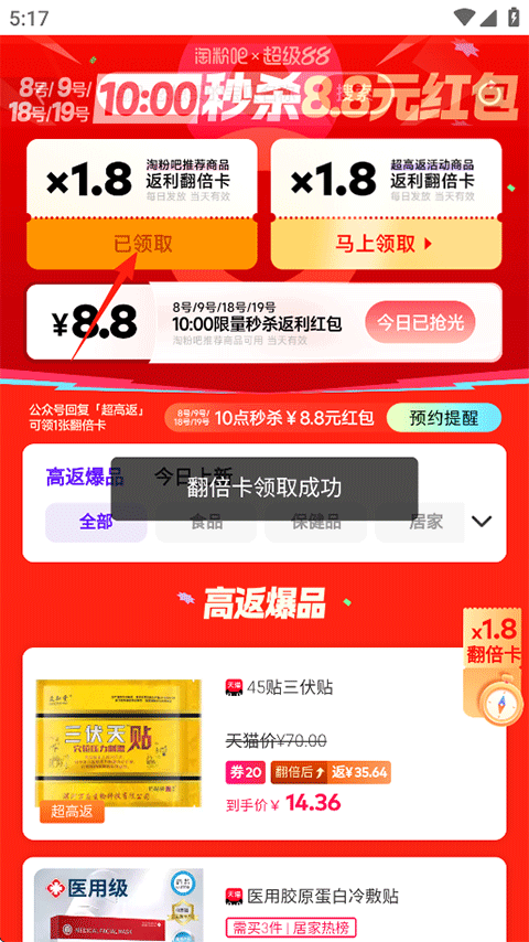 2、在页面中点击领取返利翻倍卡;