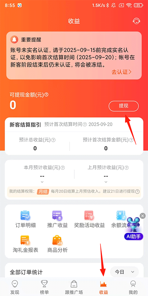 5、获得的佣金可以在APP【收益】页面进行查看并提现。
