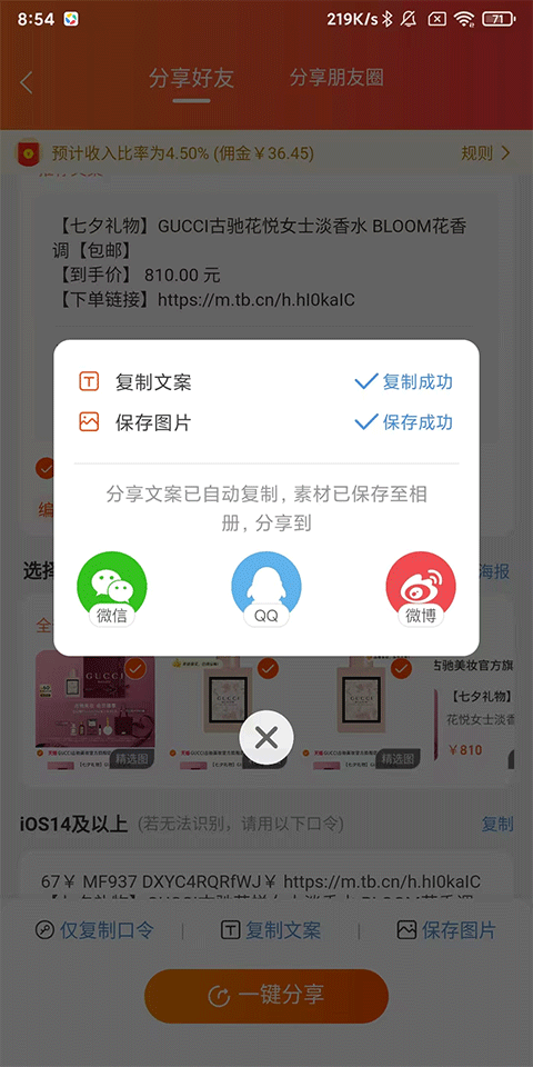 4、使用一键分享将口令分享给到微信、朋友圈、QQ、微博等社交媒体平台,当有用户点击你的链接并成功下单后就可以获得佣金;