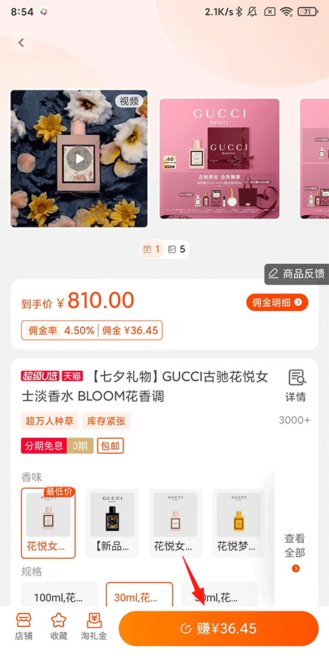 2、找到后点击进入查看该商品的详细信息,如款式、规格、适宜人群等,确认无误后点击下方【赚¥xx】;