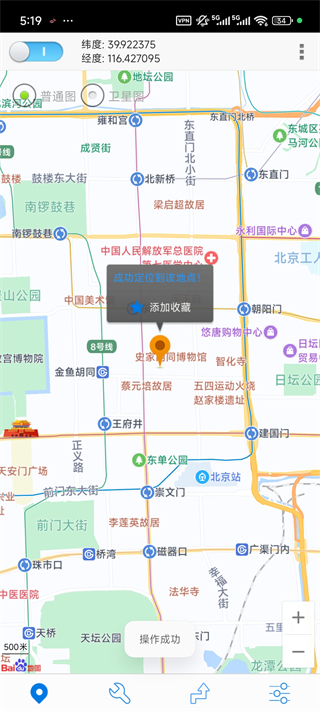 5、此时气泡上的按钮变为「添加收藏」,主界面提示「操作成功」,表示你已成功定位到新地点。