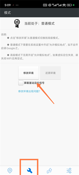 1、点击底部中间的扳手图标,进入「模式」页面,点击「修改环境」按钮;修改成功后请按提示重启手机,再打开神行者,就进入了高级模式。