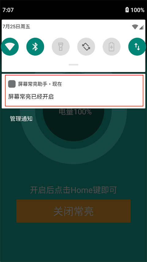 2、屏幕常亮已开启;