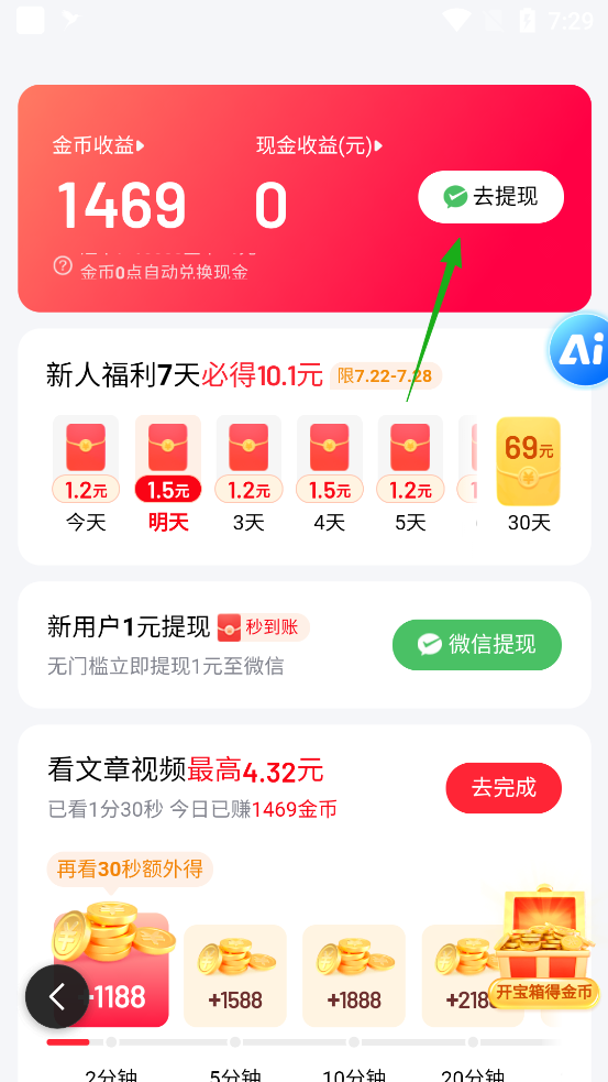 4、在阅读过程中可以看到右上角有个红包按钮,阅读的时间越久就可以获得更多金币